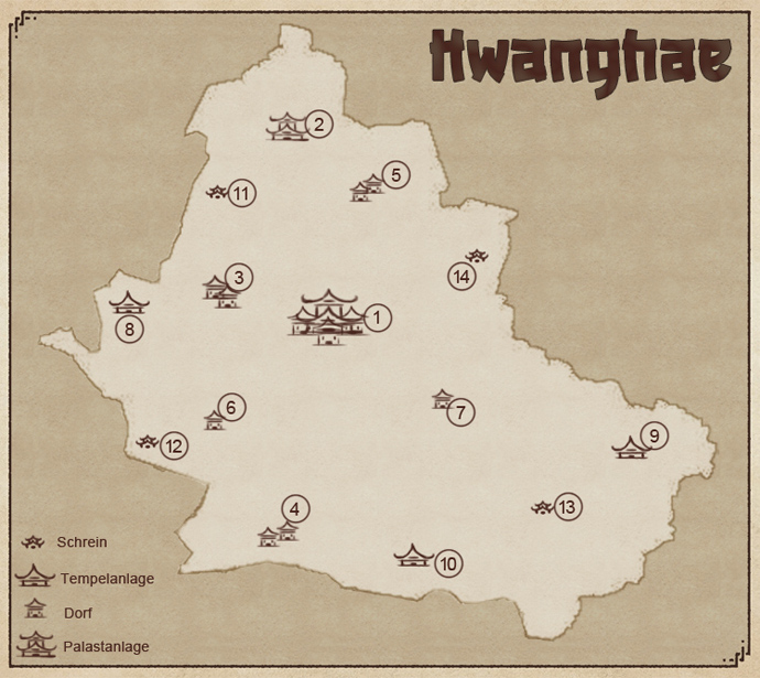 | 1 | Hauptstadt Tian'an | 8 | Hwaeomsa Tempel |