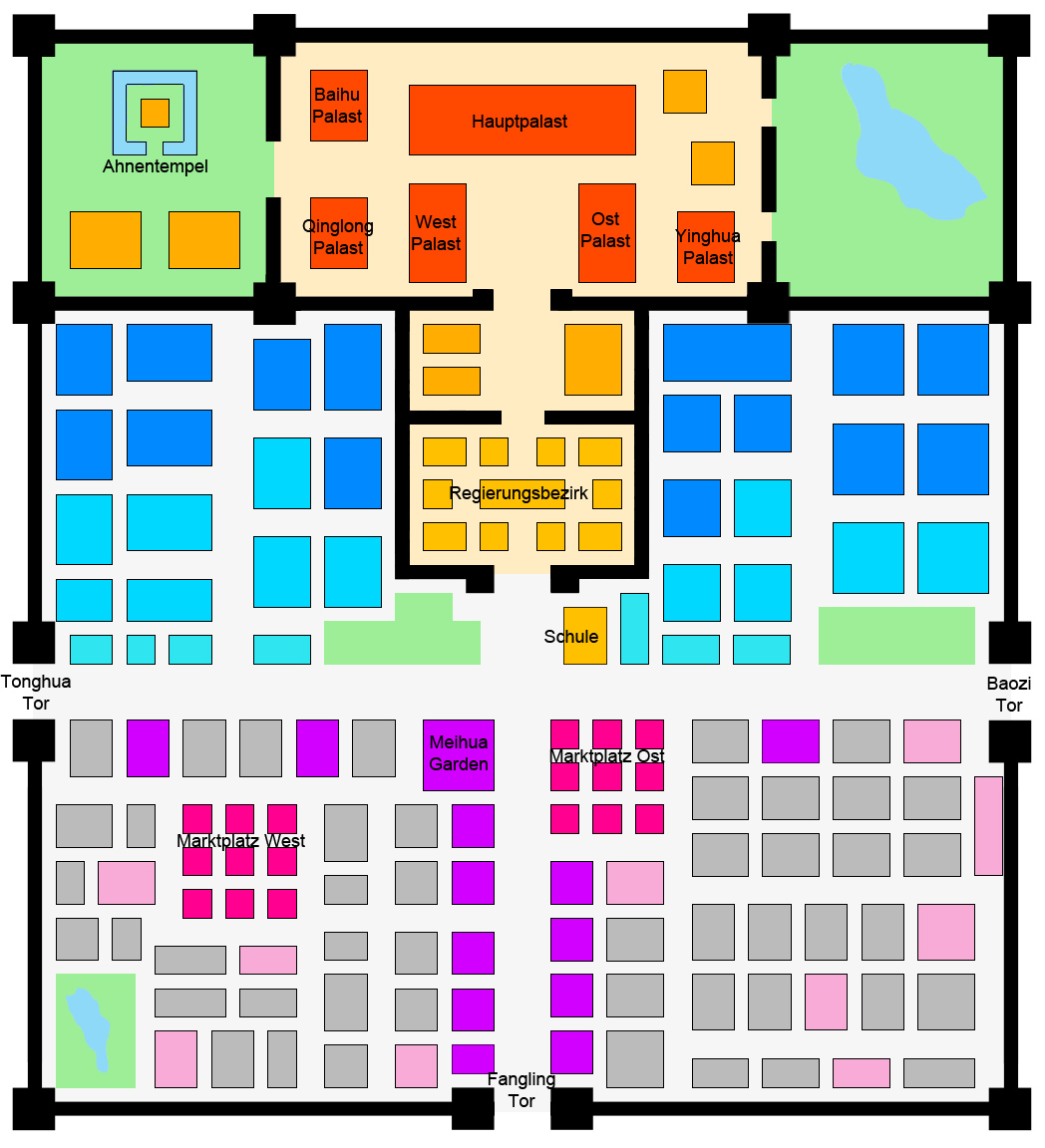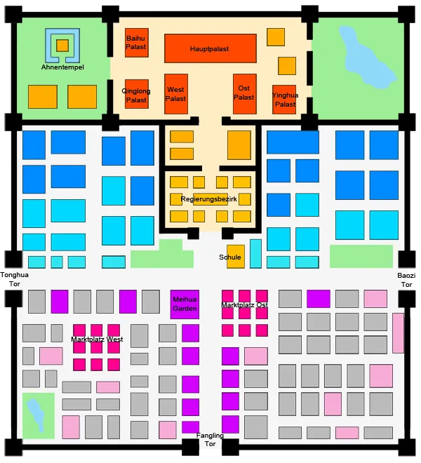 | Diese Flächen repräsentieren Gebäudegruppen, welche in erster Linie der Unterbringung der normalen Bevölkerung in Tian’an dienen. In aller Regel befinden sich auf diesen Flächen zwischen 10 und 14 Gebäude. |